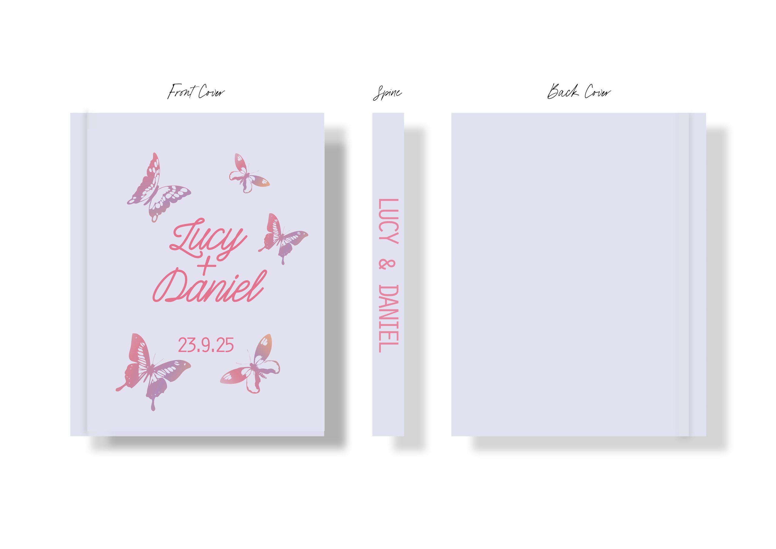 From our curated collection of luxury wedding albums and unique photo albums, this whimsical cover design features butterflies and script typography, in a lilac, mauve and pink colour palette with a playful aesthetic.