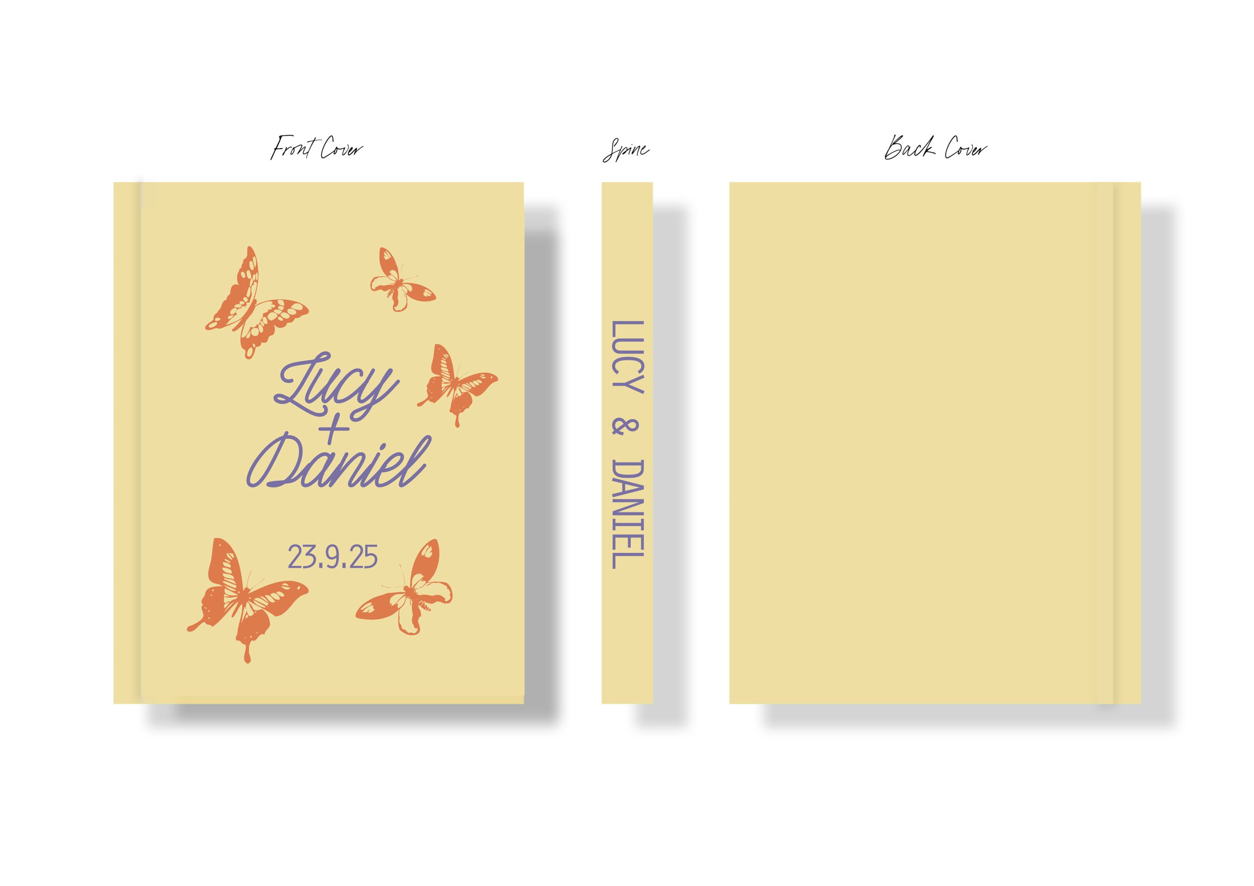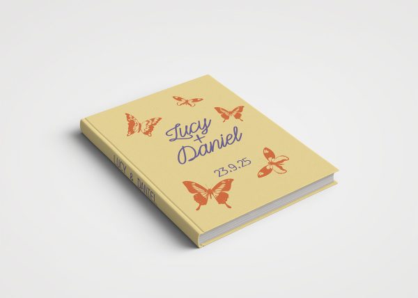 From our curated collection of luxe wedding albums and unique colourful wedding albums, this butterfly cover design features whimsical script typography, in a yellow, mauve and orange colour palette with a playful aesthetic. Create an unforgettable photo album to showcase your wedding photos. A stylish addition to add to your coffee table book collection, but this one is personal.
