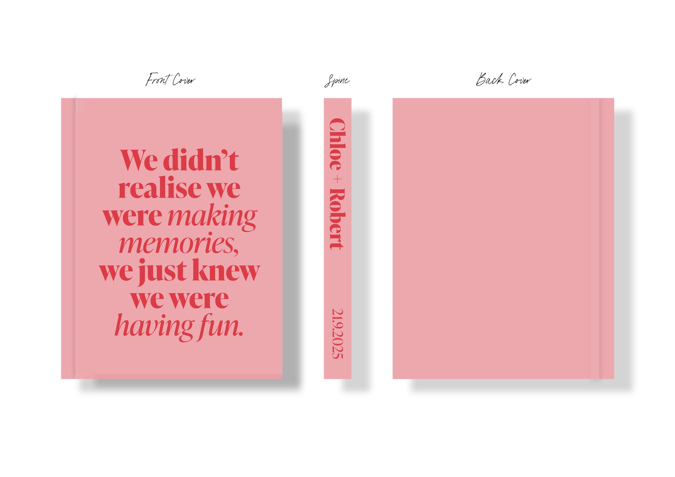From our curated collection of luxe fine art wedding albums and unique colourful wedding albums, this fun wedding album cover in pink and red with the quote “We didn’t realise we were making memories, we just knew we were having fun”. Create an unforgettable photo album to showcase your wedding day memories. A stylish addition to your coffee table book collection.