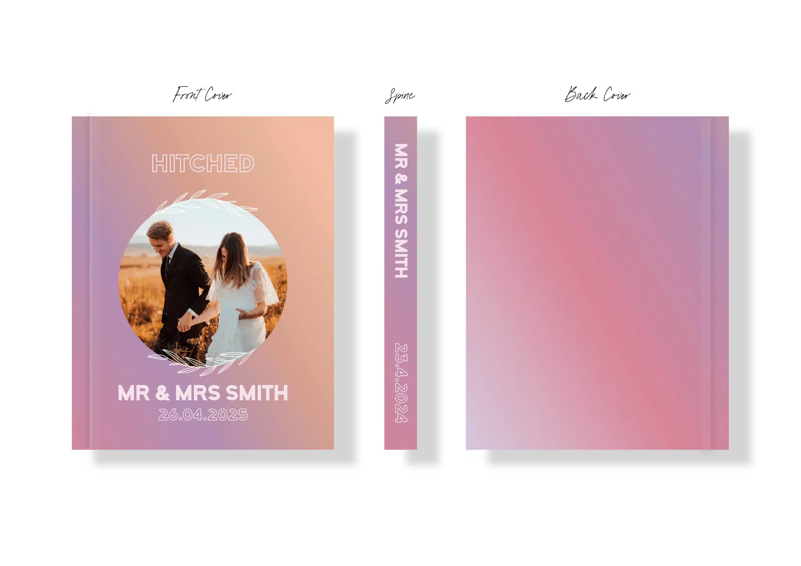 From our curated collection of luxe wedding albums and unique colourful wedding albums, this dreamy cover design features a custom photo with bold typography in white, in a peach, pink and mauve colour palette with a whimsical aesthetic. Create an unforgettable photo album to showcase your wedding photos. A stylish addition to add to your coffee table book collection, but this one is personal.