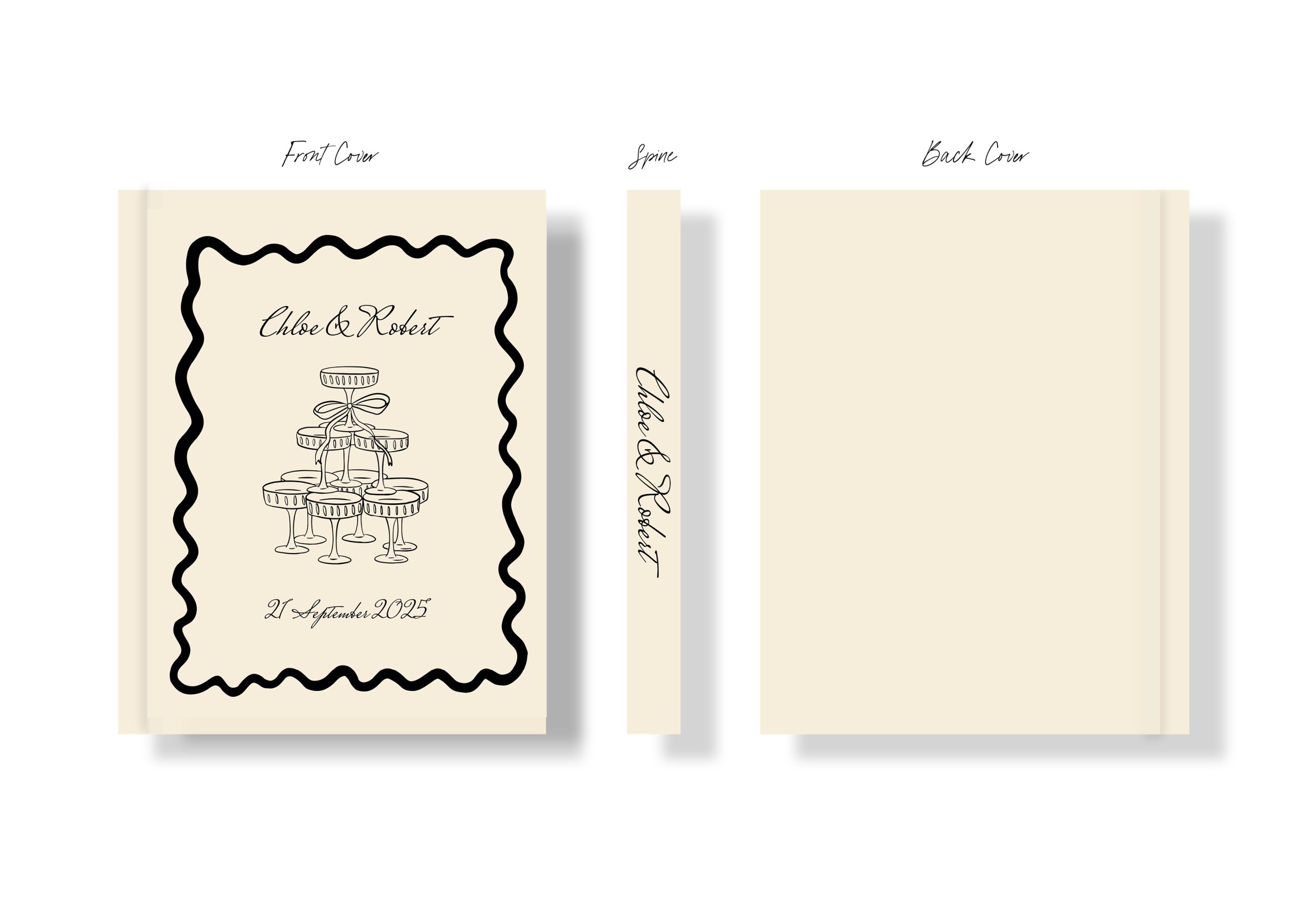 From our curated collection of luxury wedding albums and unique photo albums, this whimsical cover design features a champagne tower illustration, playful typography and a wavy border in a sophisticated neutral colour palette of beige and black.
