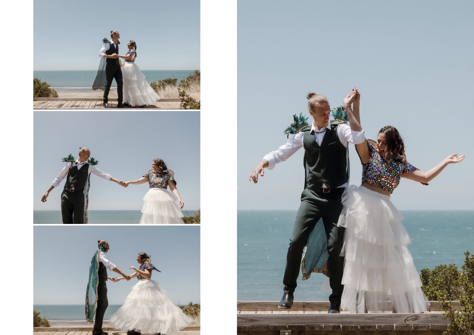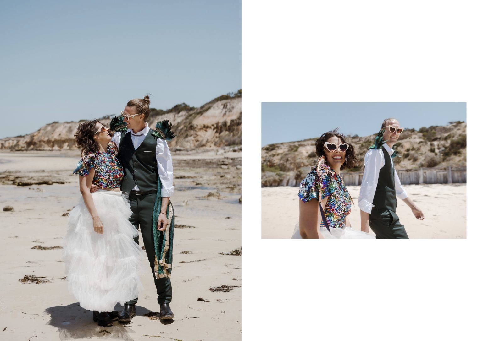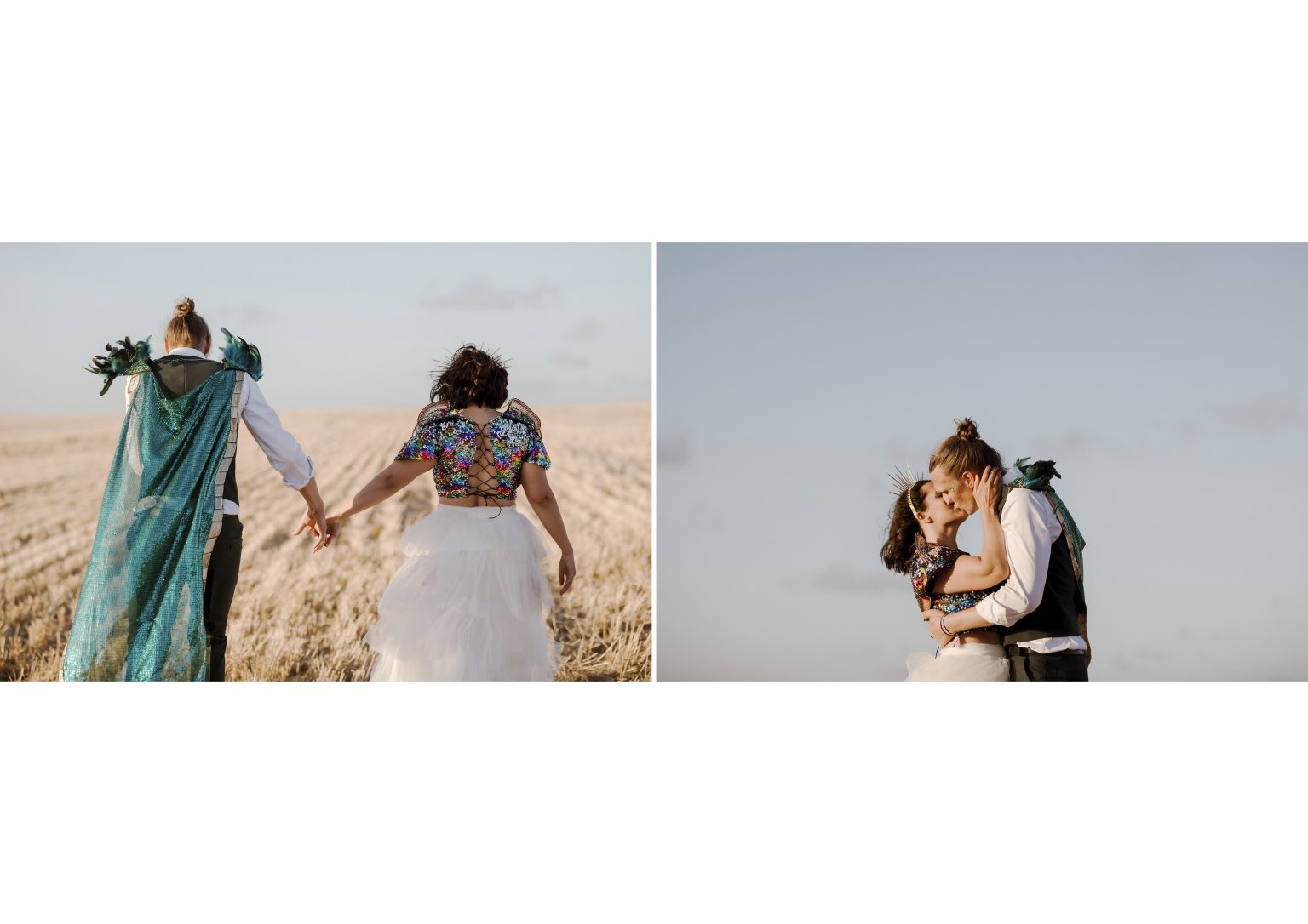 Renee and Heath’s wedding attire is as cute as this entire wedding festival. Renee wore a colourful sequin top with a white tulle skirt. Heath on the other hand wore a green cape adorned with feathers in the spirit of a music festival.