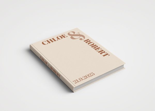 The Natural Tones personalised wedding guest book features a subtle yet bold cover design in a warm natural colour palette with a casual font. The book cover can be personalised with your names, wedding date, venue and location.