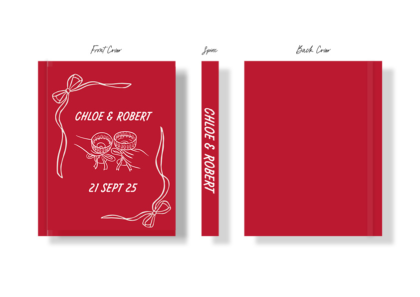 The personalised wedding guest book features a fun champagne cheers illustration in a cherry red colour palette with a casual font. The book cover can be personalised with your names, wedding date, venue and location.