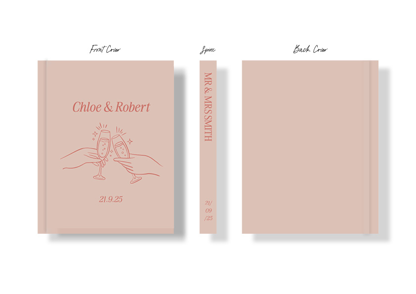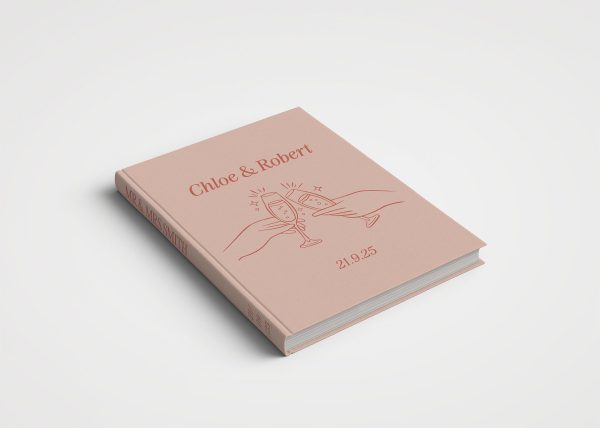 The personalised wedding guest book features a fun champagne cheers illustration in a blush pink colour palette with a casual font. The book cover can be personalised with your names, wedding date, venue and location.