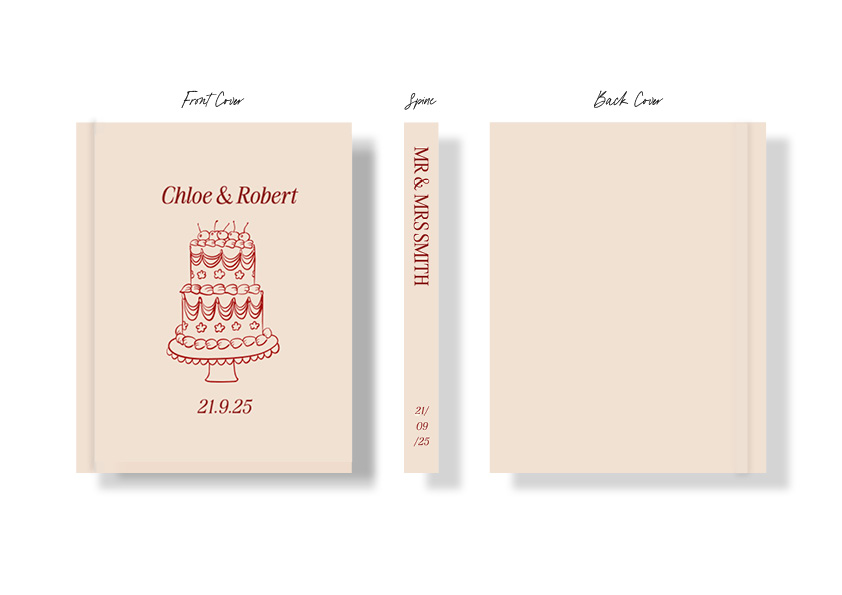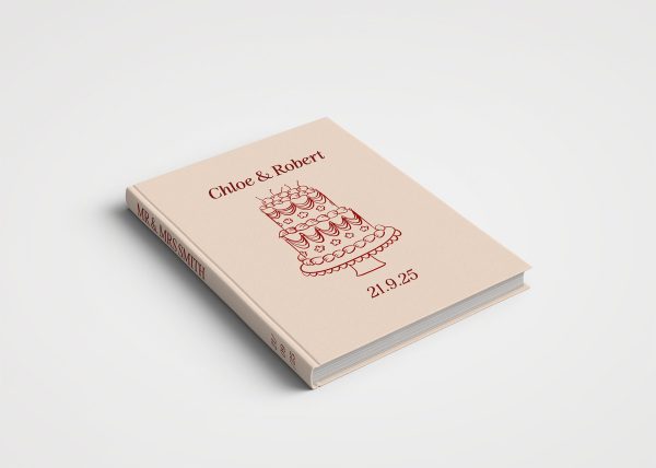 The personalised wedding guest book features a fun wedding cake illustration in a cherries and cream colour palette with a casual font. The book cover can be personalised with your names, wedding date, venue and location.
