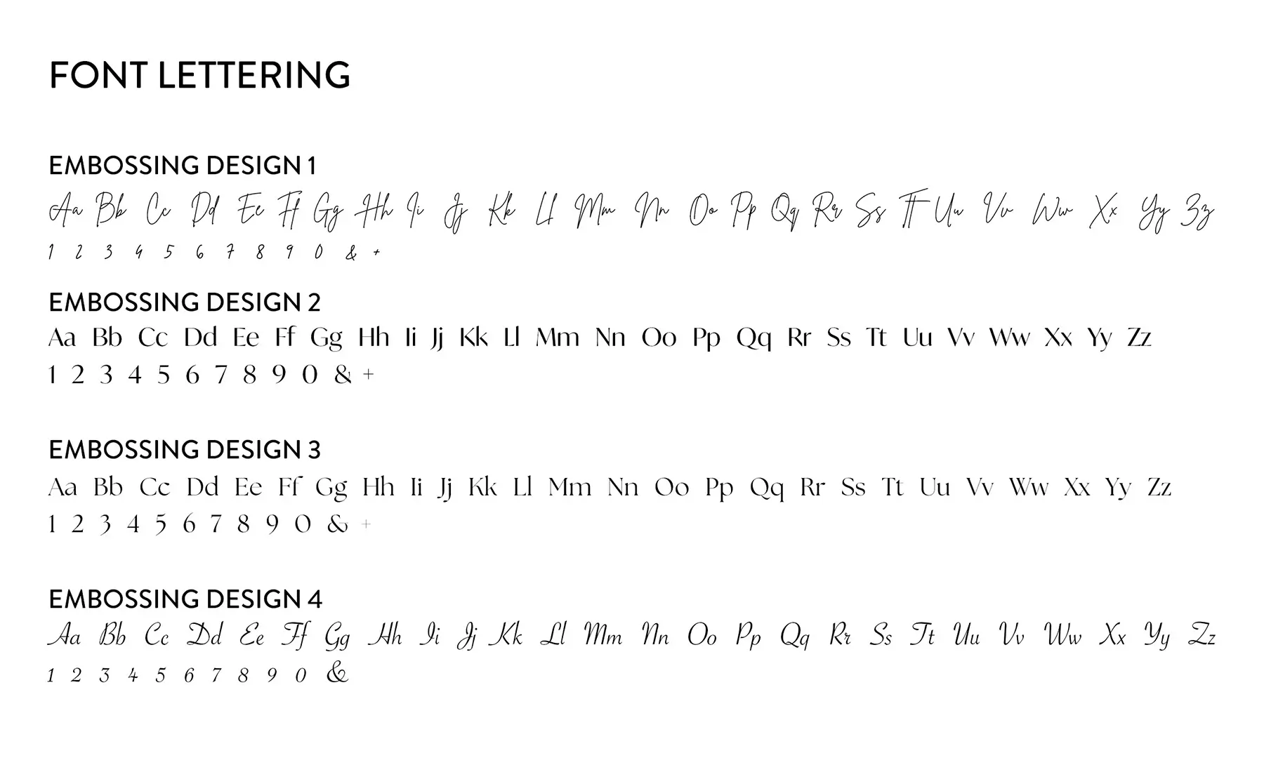 The cover can be embossed using one of four stylish designs, each with a different font choice. Each design allows for two lines of text, you can use both lines or only one – either the top or the bottom. The top line of text will be larger than the bottom line in all 4 designs. In each design, their is a maximum of 20 characters per line (including spaces) except Embossing Design 4 has a maximum of 25 characters per line.