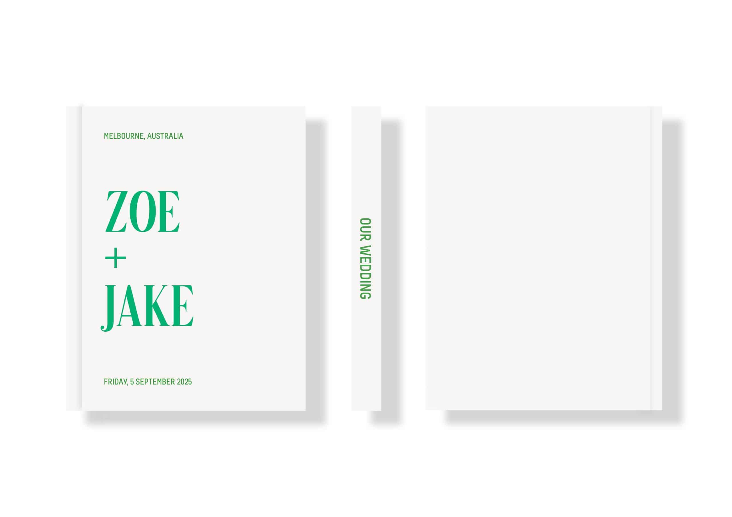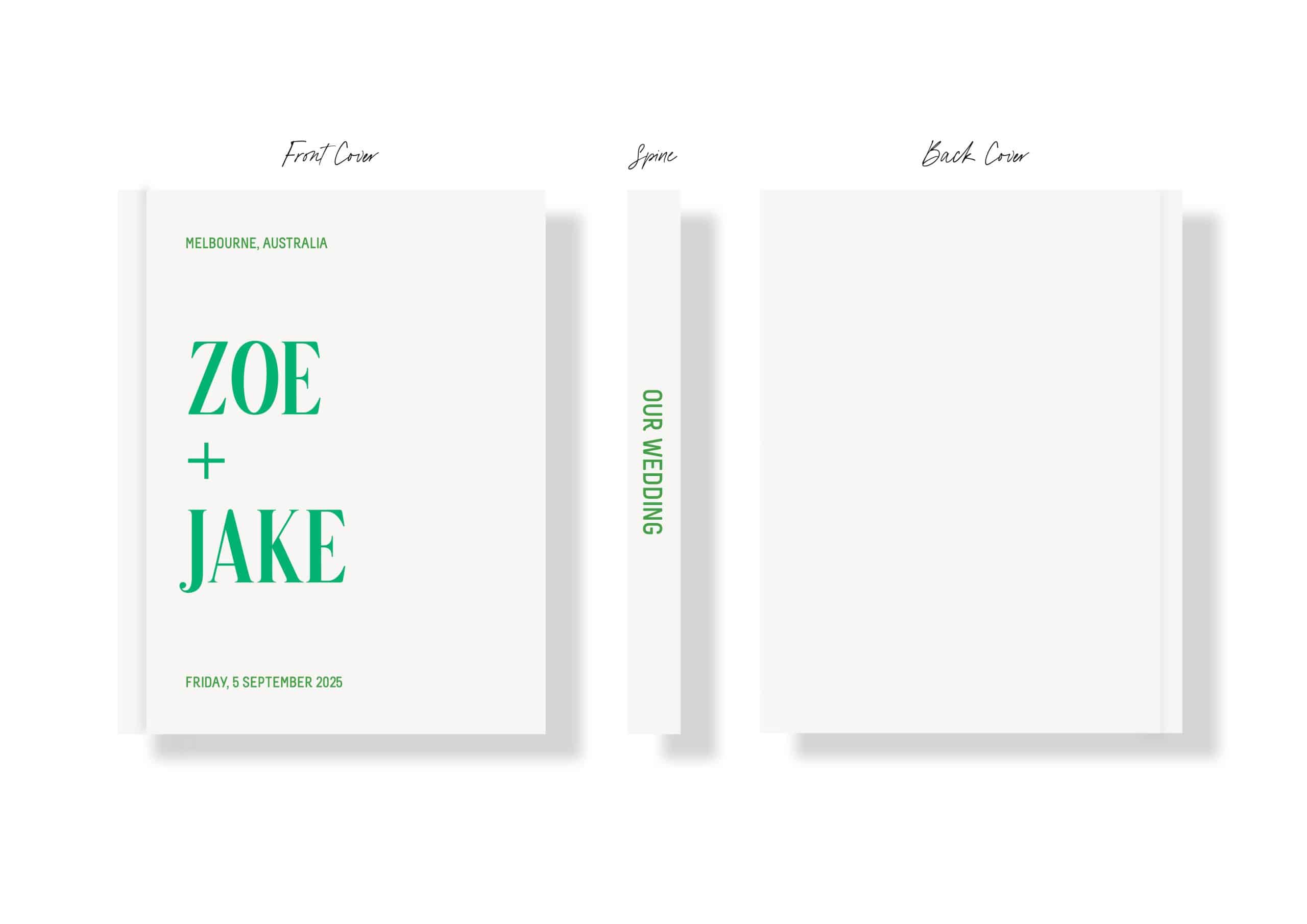 Customise the front cover with your details; your names, wedding date, wedding venue and location, while the spine features the wording “Our Wedding”.