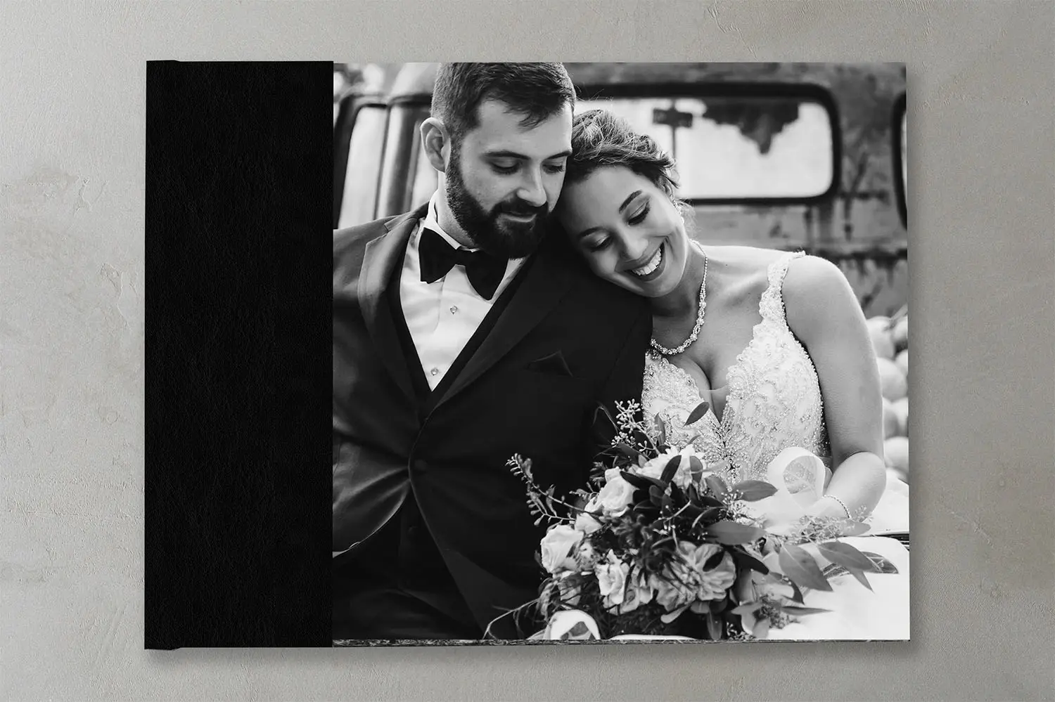 A premium wedding photo album with a luxe coffee table book look and feel. Complete with lay flat matt pages on the inside.