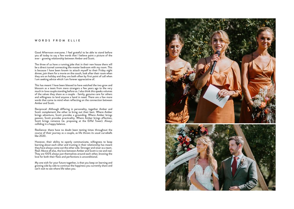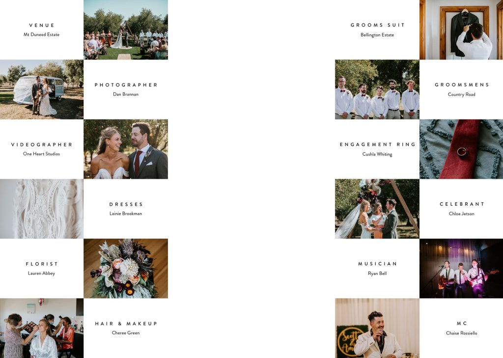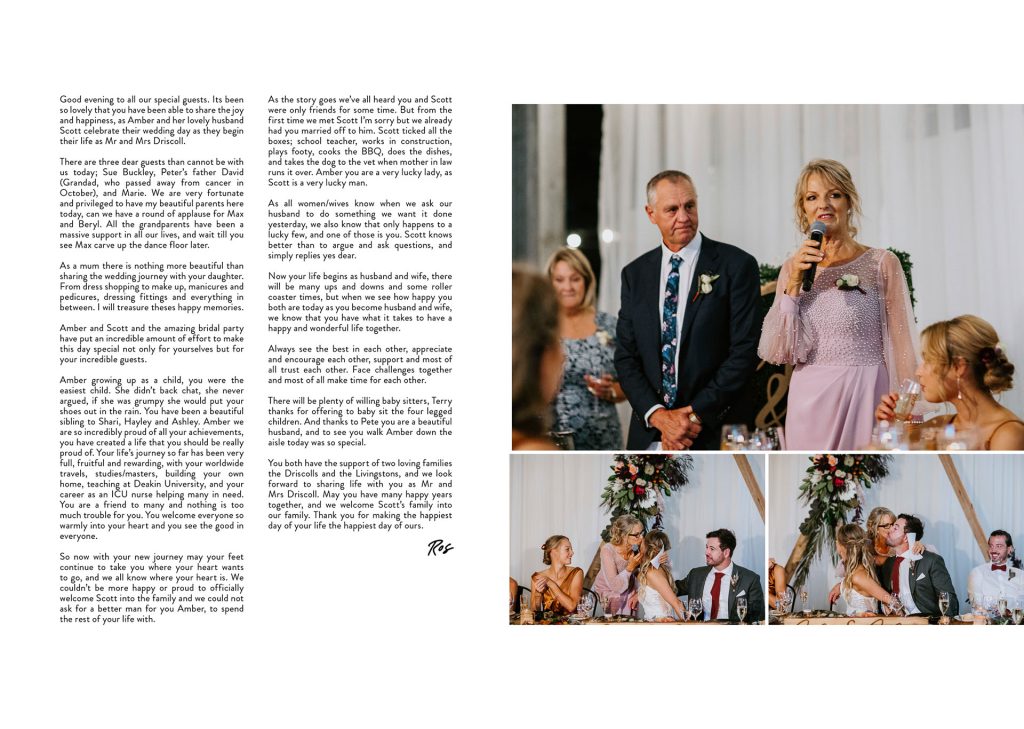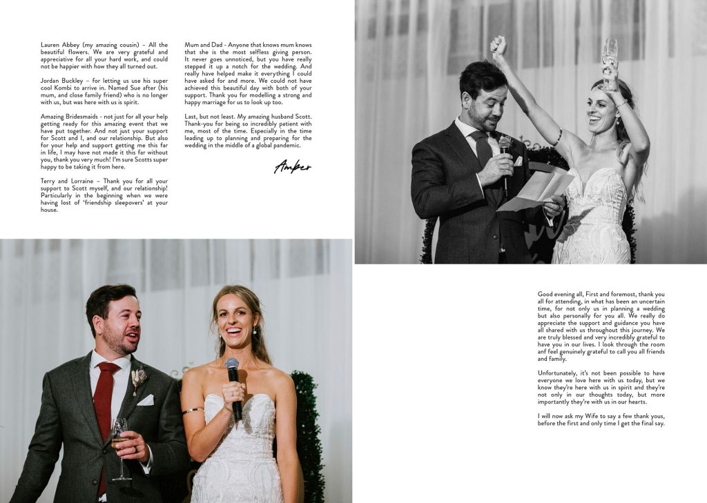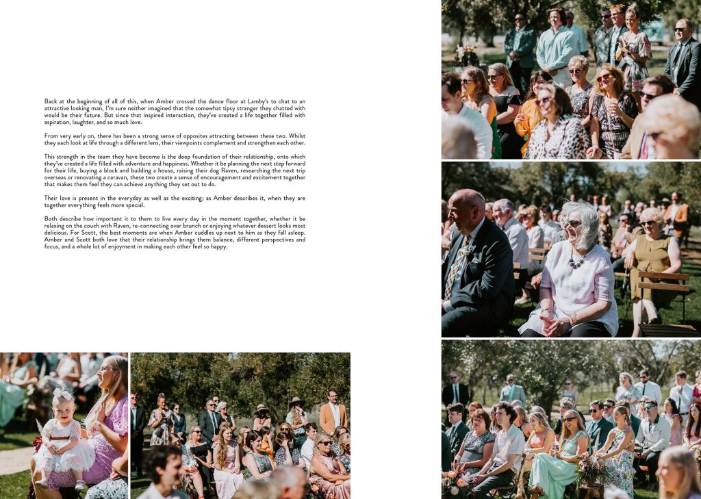 This magazine is a great example of how to scatter written stories among the photos to tell more of the couples story by including their How We Met and Proposal stories, sentimental speeches from family and friends, to the wedding supplier credits to wrap up the design, and so much more to create a truly unique and personal keepsake.