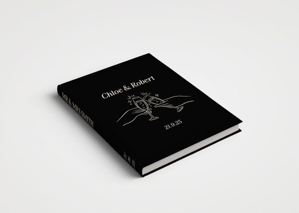 From our curated collection of luxury wedding albums and unique photo albums, this whimsical cover design features champagne glasses illustration, playful typography in a black & beige colour palette.